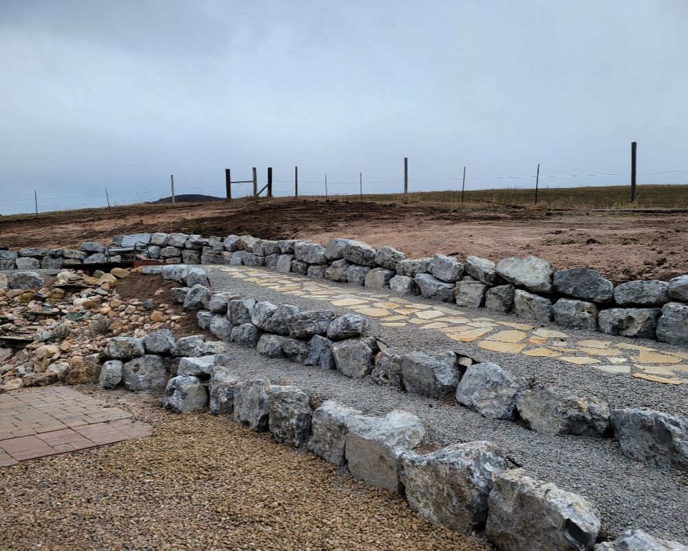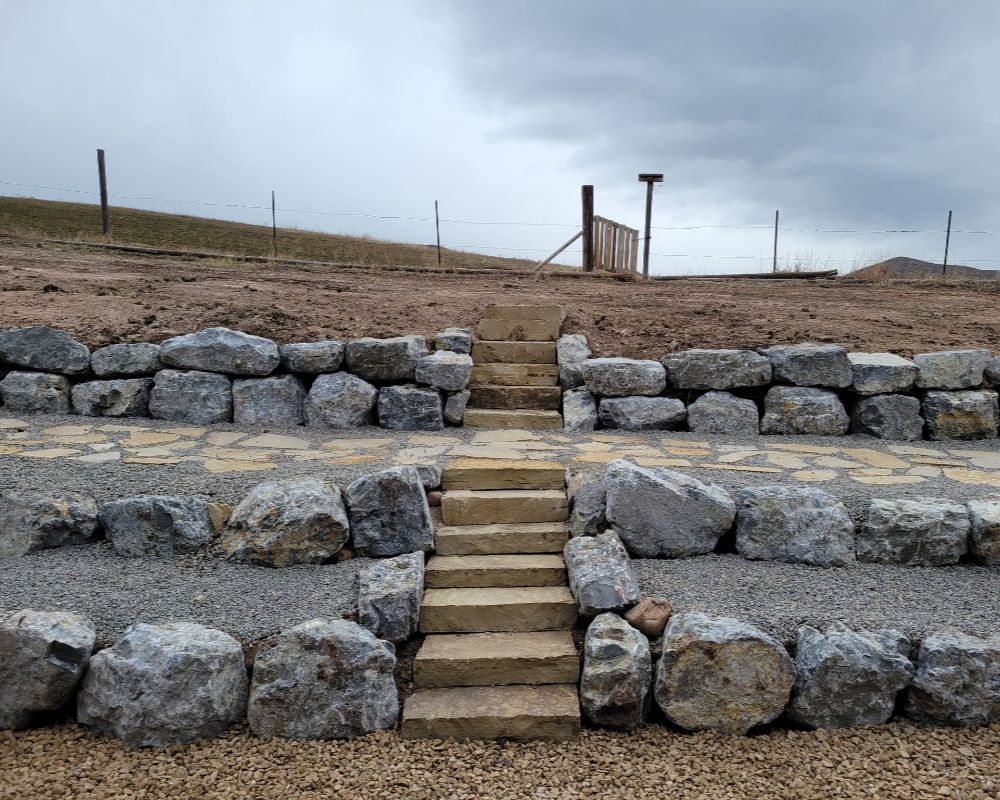 - Boulder retaining walls that add natural character while supporting elevation changes